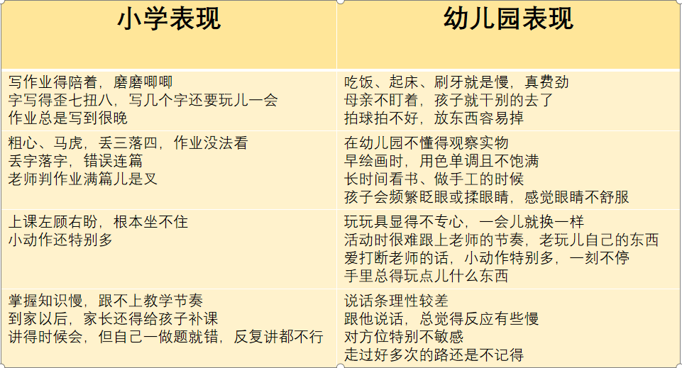 对比孩子在幼儿园和小学的表现,不难看出,幼儿在幼儿园小肌肉发展不好的(系扣子,使用剪刀、折纸),出手慢,写字慢;在幼儿园不会观察事物的,在小学容易粗心、马虎、丢三拉四;小学课堂左顾右盼的,他在幼儿园区域活动中也是频繁更换玩具或区域;掌握知识慢,无论怎么讲孩子就是不明白的,他在幼儿园语言领域一定发展的不是太好,没有养成良好的倾听和表达习惯,所以给他后续学习带来麻烦。孩子的表现有些是幼儿园的,有些是家庭的。总之,孩子行为的背后一定有它形成的原因。原生态家庭对孩子的影响是一生的,贫穷不会给孩子带来失败,精神的虐待却会给孩子带来终身的枷锁。这才是真正地让孩子输在起跑线上,而不是知识和技能的缺失。