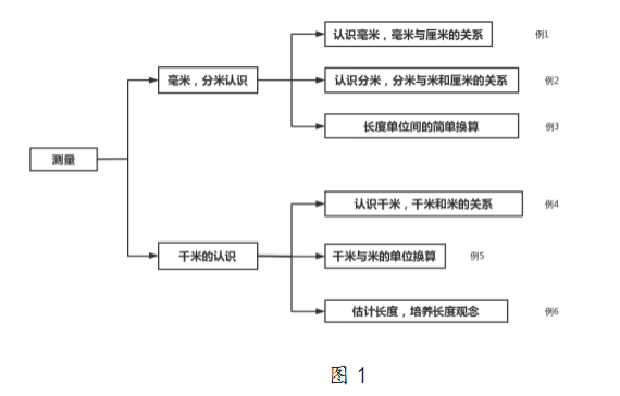 2.纵向对比、追本溯源。从表1可以看出,在二年级,学生初步认识长度单位“厘米”和“米”,经历统一度量单位的过程,这是了解测量的第一阶段;在三年级上学期,学生将要学习长度单位“毫米”“米”和“千米”, 这是理解测量的第二阶段;在中、高段学生还要学习面积单位、体积和容积单位及其测量,这是学习测量的第三、第四阶段。教材的安排从一维(长度单位)到二维(面积单位)再到三维(体积单位),逐级递增、螺旋上升。无论是长度单位、面积单位还是体积单位,从单元整体教学的角度看,它们的学习路径是一致的,都体现了度量的本质:单位的累加。而本单元的教学处于测量教学的第二阶段,是长度单位的扩充,通过这一阶段的学习,学生对常用的长度单位会有一个比较系统、完整的认识,也将完成对长度单位的建构。因此,在本单元丰富学生对每种长度单位的认知与区别,显得尤为重要。这部分内容是学生熟悉的、在生活中无处不在的内容,易激发学生的学习兴趣,体会数学的作用。本单元的教学承载着建构测量体系的重要作用,不仅是学生今后学习的重要基础,也为提高学生的解决问题能力和实践能力创造了条件。