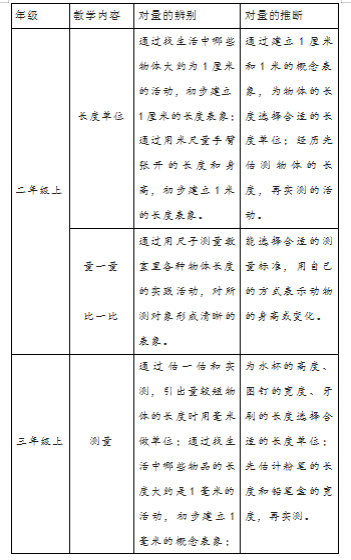 1.小学数学“量感”培养的渗透过程。量感在度量单位教学中的表现为“对量的区分(或量的辨别)”和“对量的推断”。“对量的辨别”是指区分不同度量单位表示的量与生活中的哪个量相吻合;“对量的推断”是指学生在不借助测量工具或者计算公式的情况下能够选择合适的度量单位对某个量进行推断。