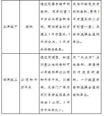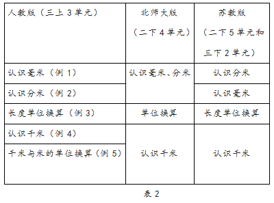不同点:由表2可知,三个版本的教材将测量分别安排在了不同的学段,但都涵盖了测量的基本内容。通过不同教材编排的情况,我们还发现,这一内容的教学弹性也很大,既可以在二年级教,也可以在三年级教,苏教版教材还将“认识千米”放在了三年级下册学习。人教版坚持“步子小”的原则,分6课时完成长度单位的教学;北师版将“认识毫米和分米”整合为1课时,在“认识千米”的课时中融合了多角度思考问题的思想。人教版单独用一个例题解决估测问题,感受解决估测问题策略的多样化,从多种方法中体会估量的本质——先选择一个自己熟悉的标准,再用这个标准去估“量”。